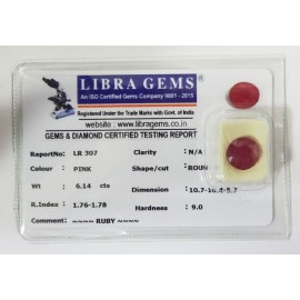 REPORT.NO.-LR 307CLARITY.-N/ACOLOUR.-PINKSHAPE/CUT.-ROUNDWT.-6.14 CTSDIMENSION.-10.7-10.4-5.7R.INDEX.-1.76-1.78-HARDNESS.-9.0COMMENT.-RUBY..