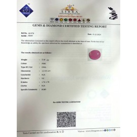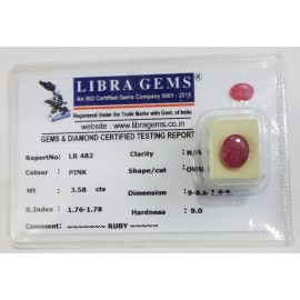 REPORT.NO.LR 482CLARITY.N/ACOLOUR.PINKSHAPE/CUT.OVALWT.3.58 CTSDIMENSION.9.8-8.1-4.6R.INDEX.1.76-1.78HARDNESS.9.0COMMENT.RUBY..