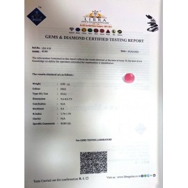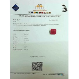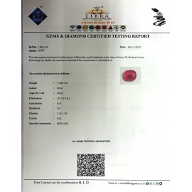 REPORT NO . LR 208CLARITY . N/ACOLOUR . PINKSHAPE / CUT . OVALWT . 4.29 CTSDIMENSION . 9-6.8-1.5-4.R . INDEX . 1.76-1.78HARDNESS . 9.0COMMENT . RUBY..