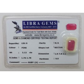 REPORT NO . LRA 8CLARITY . N/ACOLOUR . PINKSHAPE / CUT . RECTANGLEWT . 5.12 CTSDIMENSION . 1-9.7-8.4-4.R . INDEX . 1.76-1.78HARDNESS . 9.0COMMENT . RUBY { A }..