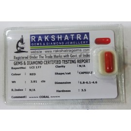 REPORT NO . LCI 177CLARITY . N/ACOLOUR . REDSHAPE / CUT . CAPSULEWT . 3.91 CTSDIMENSION . 5-8.6-1.4-6.R . INDEX . N/AHARDNESS . 3.5COMMENT . CORAL..