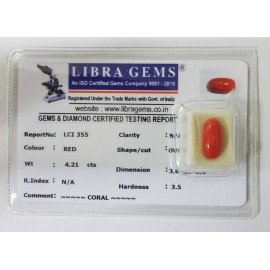 REPORT NO . LCI 327CLARITY . N/ACOLOUR . REDSHAPE / CUT . OVALWT . 4.17 CTSDIMENSION . 3-5.6-3.5-3.R . INDEX . N/AHARDNESS . 3.5COMMENT . CORAL..