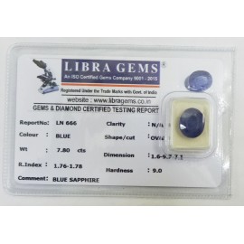 REPORT.NO.LN 666CLARITY.N/ACOLOUR.BLUESHAPE/CUT.OVAL WT.7.80 CTSDIMENSION.1.6-9.7-7.1R.INDEX.1.76-1.7.8HARDNESS.9.0COMMENT.BLUE SAPPHIRE..