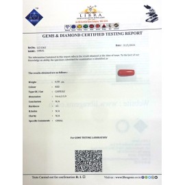 REPORT NO . LCI 231CLARITY . N/ACOLOUR . REDSHAPE / CUT . CAPSULEWT . 5.60 CTSDIMENSION . 10-3.6-4.4-8.R . INDEX . N/AHARDNESS . 3.5COMMENT . CORAL..