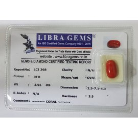 REPORT NO . LCI 368CLARITY . N/ACOLOUR . REDSHAPE / CUT . OVALWT . 3.95 CTSDIMENSION . 2-5.7-1.5-3.R . INDEX . N/AHARDNESS . 3.5COMMENT . CORAL..