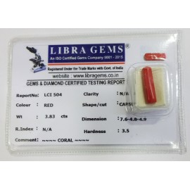 REPORT.NO.LCI 504CLARITY.N/ACOLOUR.REDSHAPE/CUT.CAPSULEWT.3.83 CTSDIMENSION.7.6-7.8-4.9R.INDEX.N/AHARDNESS.3.5COMMENT.CORAL..