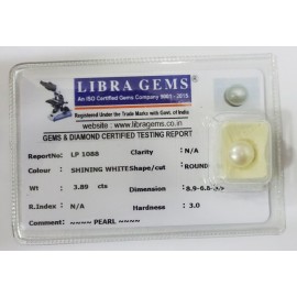 REPORT NO . LP 1088CLARITY . N/ACOLOUR . SHINING WHITESHAPE / CUT . ROUNDWT . 3.89 CTSDIMENSION . 8-9.6-8.8-9.R . INDEX . N/AHARDNESS . 3.0COMMENT . PEARL..