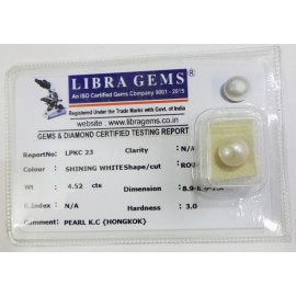 REPORT.NO.-LPKC 23CLARITY.-N/ACOLOUR.-SHINING WHITESHAPE/CUT.-ROUNDWT.-4.52 CTSDIMENSION.-8-9.8-9.7-8.R.INDEX.-N/AHARDNESS.-3.0COMMENT.-PEARL K.C { HONGKOK }..