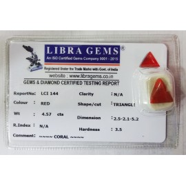 REPORT NO . LCI 144CLARITY . N/ACOLOUR . REDSHAPE / CUT . TRIANGLEWT . 4.57 CTSDIMENSION . 2-5.2-1.5-2.R . INDEX . N/AHARDNESS . 3.5COMMENT . CORAL..