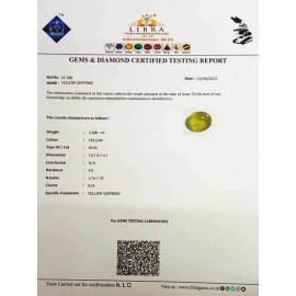 REPORT NO . LY 295CLARITY . N/ACOLOUR . YELLOWSHAPE / CUT . OVALWT . 3.28 CTSDIMENSION . 9-5.7-4.4-5.R . INDEX . 1.76-1.78HARDNESS . 9.0COMMENT . YELLOW SAPPHIRE..