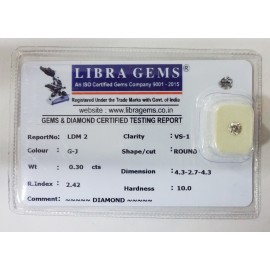 REPORT NO . LDM 2CLARITY . VS -1COLOUR . G-JSHAPE / CUT . ROUNDWT . 0.30 CTSDIMENSION . 4-3.2-7.4-3.R . INDEX . 2.42HARDNESS . 10.0COMMENT . DIAMOND..