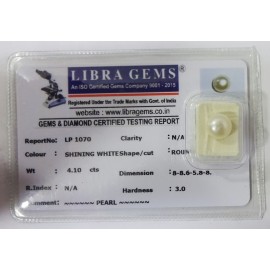REPORT NO . LP 1070CLARITY . N/ACOLOUR . SHINING WHITESHAPE / CUT . ROUNDWT . 4.10 CTSDIMENSION . 8-8.6-5.8-8.R . INDEX . N/AHARDNESS . 3.0COMMENT . PEARL..