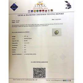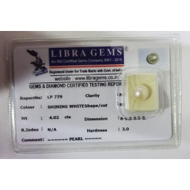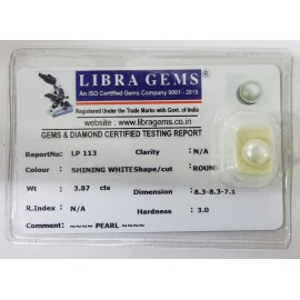 REPORT NO . LP 113CLARITY . N/ACOLOUR . SHINING WHITESHAPE / CUT . ROUNDWT . 3.87 CTSDIMENSION . 8-3.8-3.7-1.R . INDEX . N/AHARDNESS . 3.0COMMENT . PEARL..