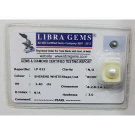 REPORT NO . LP 615CLARITY . N/ACOLOUR . SHINING WHITESHAPE / CUT . ROUNDWT . 3.40 CTSDIMENSION . 8-2.8-2.6-7.R . INDEX . N/AHARDNESS . 3.0COMMENT . PEARL..