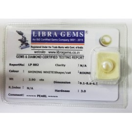 REPORT NO . LP 882CLARITY . N/ACOLOUR . SHINING WHITESHAPE / CUT . ROUNDWT . 3.90 CTSDIMENSION . 9-1.8-8.6-1.R . INDEX . N/AHARDNESS . 3.0COMMENT . PEARL..