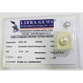 REPORT.NO.-LPKC 36CLARITY.-N/ACOLOUR.-SHINING WHITESHAPE/CUT.-ROUNDWT.-4.63 CTSDIMENSION.-9-2.9-2.7-4.R.INDEX.-N/AHARDNESS.-3.0COMMENT.-PEARL K.C { HONGKOK }..
