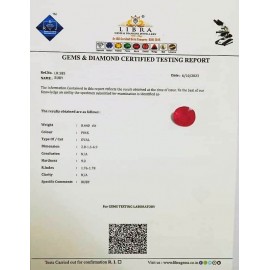 DATE: 17-3-2025REF.NO: LRB 99NAME: RUBYWEIGHT:  4.59 CTSCOLOUR: PINKTYPE OF/CUT: OVALDIMENSION:  1.4-9.1-4.7/CONCLUSION: N/AHARDNESS: 9.0R.INDEX: 1.76-1.78CLARITY: N/A ..