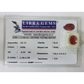 REPORT NO . LR 13CLARITY . N/ACOLOUR . PINKSHAPE / CUT . OVALWT. 4.15 CTSDIMENSION . 10-1.7-9.5-3.R . INDEX . 1.76-1.78HARDNESS . 9.0COMMENT . RUBY..