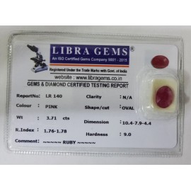 REPORT NO . LR 140CLARITY . N/ACOLOUR . PINKSHAPE / CUT . OVALWT . 3.71 CTSDIMENSION . 10-4.7-9.4-4.R . INDEX . 1.76-1.78HARDNESS . 9.0COMMENT . RUBY..