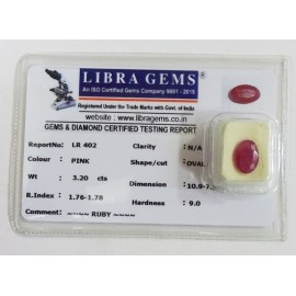 REPORT.NO.-LR 402CLARITY.-N/ACOLOUR.-PINKSHAPE/CUT.-OVALWT.-3.20 CTSDIMENSION.-10-9.7-5.4-1.R.INDEX.-1.76-1.78HARDNESS.-9.0COMMENT.-RUBY..