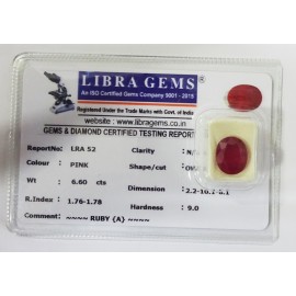 REPORT NO . LRA 52CLARITY . N/ACOLOUR . PINKSHAPE / CUT . OVALWT . 6.60 CTSDIMENSION . 2-2.10-1.6-1.R . INDEX . 1.76-1.78HARDNESS . 9.0COMMENT . RUBY { A }..