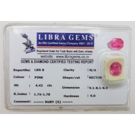 REPORT NO . LRS 8CLARITY . N/ACOLOUR . PINKSHAPE / CUT . RECTANGLEWT . 4.42 CTSDIMENSION . 9-1.8-1.6-3.R . INDEX . 1.76-1.78HARDNESS . 9.0COMMENT . RUBY { S }..