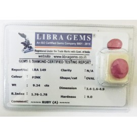 REPORT.NO.-LRA 149CLARITY.-N/ACOLOUR.-PINKSHAPE/CUT.-OVALWT.-9.24 CTSDIMENSION.-3-4.1-6.4-9.R.INDEX.-1.76-1.78HARDNESS.-9.0COMMENT.-RUBY { A }..