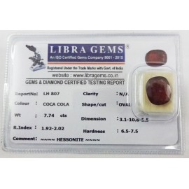 REPORT.NO.-LH 558CLARITY.-N/ACOLOUR.-COCA COLASHAPE/CUT.-OVALWT.-5.12 CTSDIMENSION.-3-1.8-7.4-7.R.INDEX.-1.92-2.02HARDNESS.-6.5-7.5COMMENT.-HESSONITE..