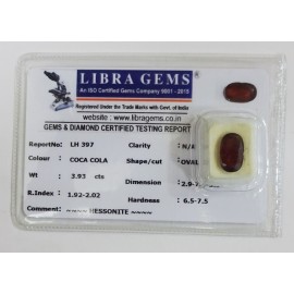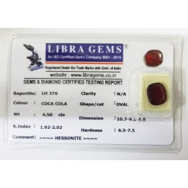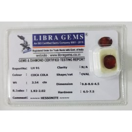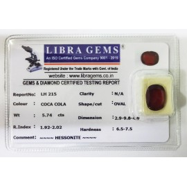 REPORT.NO.-LH 374CLARITY.-N/ACOLOUR.-COCA COLASHAPE/CUT.-OVALWT.-5.12 CTSDIMENSION.-1-4.9-2.5-4.R.INDEX.-1.92-2.02HARDNESS.-6.5-7.5COMMENT.-HESSONITE..