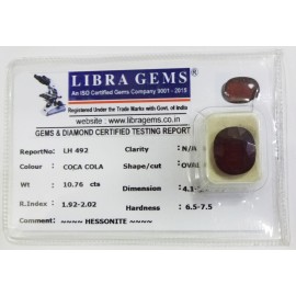 REPORT.NO.-LH 622CLARITY.-N/ACOLOUR.-COCA COLASHAPE/CUT.-OVALWT.-10.10 CTSDIMENSION.-5-2.1-4.7-2.R.INDEX.-1.92-2.02HARDNESS.-6.5-7.5COMMENT.-HESSONITE..