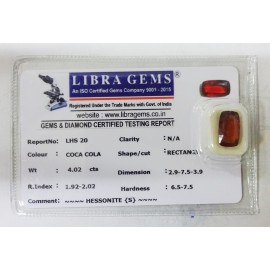 REPORT NO . LH 93CLARITY . N/ACOLOUR . COCA COLASHAPE / CUT . OVALWT . 4.15 CTSDIMENSION . 1-2.8-4.4-8.R . INDEX . 1.92-2.02HARDNESS . 6.5-7.5COMMENT . HESSONITE..