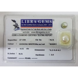 REPORT NO . LP 198CLARITY . N/ACOLOUR . SHINING WHITESHAPE / CUT . ROUNDWT . 4.51 CTSDIMENSION . 9-3.9-8.6-1.R . INDEX . N/AHARDNESS . 3.0COMMENT . PEARL..