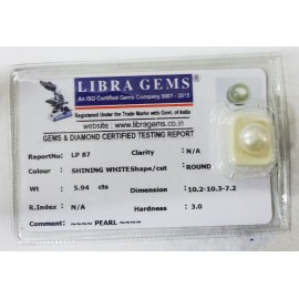 REPORT NO . LP 87CLARITY . N/ACOLOUR . SHINING WHITESHAPE / CUT . ROUNDWT . 5.94 CTSDIMENSION . 10-2.10-3.7-2.R . INDEX . N/AHARDNESS . 3.0COMMENT . PEARL..