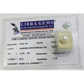 REPORT.NO.-LPKC 49CLARITY.-N/ACOLOUR.-SHINING WHITESHAPE/CUT.-ROUNDWT.-4.36 CTSDIMENSION.-8-6.8-6.8-2.R.INDEX.-N/AHARDNESS.-3.0COMMENT.-PEARL K.C { HONGKOK }..