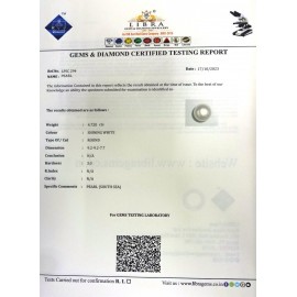 REPORT.NO.LP 1162CLARITY.N/A COLOUR.SHINING WHITE SHAPE/CUT.ROUND WT.5.93 CTS DIMENSION.10.4-10.3-7.4R.INDEX.N/AHARDNESS.3.0COMMENT.PEARL ..
