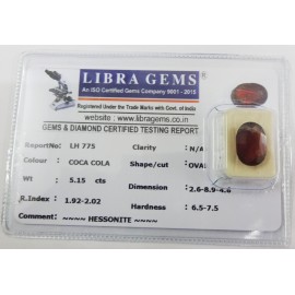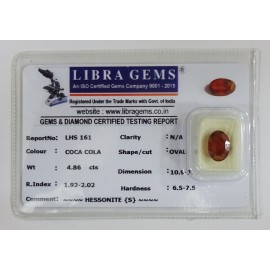 REPORT.NO.-LHS 161CLARITY.-N/ACOLOUR.-COCA COLASHAPE/CUT.-OVALWT.-4.86 CTSDIMENSION.-10-9.7-6.6-1.R.INDEX.-1.92-2.02HARDNESS.-6.5-7.5COMMENT.-HESSONITE { S }..