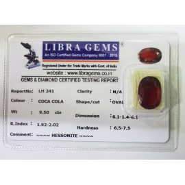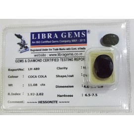 REPORT.NO.-LH 489CLARITY.-N/ACOLOUR.-COCA COLASHAPE/CUT.-OVALWT.-11.08 CTSDIMENSION.-4-8.2-1.6-8.R.INDEX.-1.92-2.02HARDNESS.-6.5-7.5COMMENT.-HESSONITE..