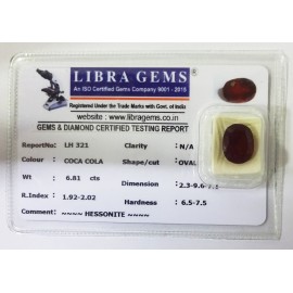 REPORT.NO.-LH 321CLARITY.-N/ACOLOUR.-COCA COLASHAPE/CUT.-OVALWT.-6.81 CTSDIMENSION.-2-3.9-6.7-1.R.INDEX.-1.92-2.02HARDNESS.-6.5-7.5COMMENT.-HESSONITE..
