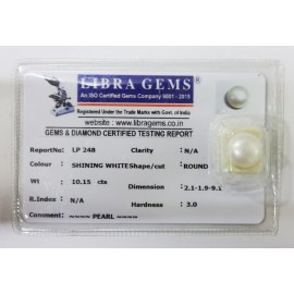 REPORT NO . LP 248CLARITY . N/ACOLOUR . SHINING WHITESHAPE / CUT . ROUNDWT . 10.15 CTSDIMENSION . 2-1.1-9.9-1.R . INDEX . N/AHARDNESS . 3.0COMMENT . PEARL..