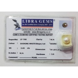 REPORT NO . LP 700CLARITY . N/ACOLOUR . SHINING WHITESHAPE / CUT . ROUNDWT . 3.65 CTSDIMENSION . 8-1.8-1.6-6.R . INDEX . N/AHARDNESS . 3.0COMMENT . PEARL..