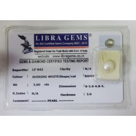 REPORT NO . LP 842CLARITY . N/ACOLOUR . SHINING WHITESHAPE / CUT . ROUNDWT . 3.60 CTSDIMENSION . 8-5.6-6.8-5.R . INDEX . N/AHARDNESS . 3.0COMMENT . PEARL..