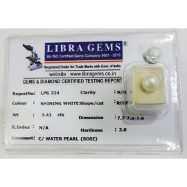 REPORT.NO.-LPS 324CLARITY.-N/ACOLOUR.-SHINING WHITESHAPE/CUT.-ROUNDWT.-3.41 CTSDIMENSION.-7-7.7-8.7-8.R.INDEX.-N/AHARDNESS.-3.0COMMENT.-C / WATER PEARL { SOSI }..