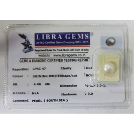 REPORT NO . LPSC 47CLARITY . N/ACOLOUR . SHINING WHITESHAPE / CUT . ROUNDWT . 4.48 CTSDIMENSION . 9-1.7-7.9-1.R . INDEX . N/AHARDNESS . 3.0COMMENT . PEARL { SOUTH SEA }..