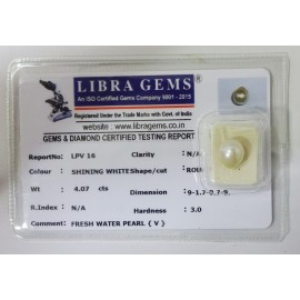 REPORT NO . LPV16CLARITY . N/ACOLOUR . SHINING WHITESHAPE / CUT . ROUNDWT . 4.07 CTSDIMENSION . 9-1.7-9.7-9.R . INDEX . N/AHARDNESS . 3.0COMMENT . FRESH WATER PEARL { V }..