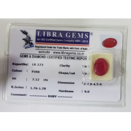 REPORT NO . LR 22CLARITY . N/ACOLOUR . PINKSHAPE / CUT . OVALWT . 7.55 CTSDIMENSION . 2-4.8-4.7-1.R . INDEX . 1.76-1.78HARDNESS . 9.0COMMENT . RUBY..