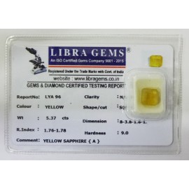REPORT.NO.LYA 96CLARITY.N/ACOLOUR.YELLOWSHAPE/CUT.SQUAREWT.5.37 CTSDIMENSION.8.3-8.1-6.1R.INDEX.1.76-1.78HARDNESS.9.0COMMENT.YELLOW SAPPHIRE {A}..