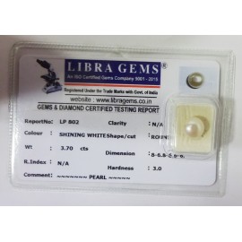 REPORT NO . LP 802CLARITY . N/ACOLOUR . SHINING WHITESHAPE / CUT . ROUNDWT . 3.70 CTSDIMENSION . 8-6.8-6.6-6.R . INDEX . N/AHARDNESS . 3.0COMMENT . PEARL..