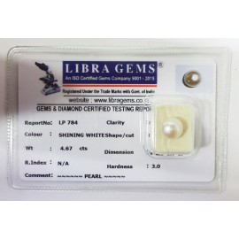REPORT NO . LP 784CLARITY . N/ACOLOUR .SHINING WHITESHAPE / CUT . ROUNDWT . 4.67 CTSDIMENSION . 9-2.9-1.7-1.R . INDEX . N/AHARDNESS . 3.0COMMENT . PEARL..