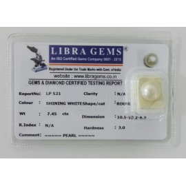 REPORT NO . LP 521CLARITY . N/ACOLOUR . SHINING WHITESHAPE / CUT . ROUNDWT . 7.45 CTSDIMENSION . 10-5.10-2.8-3.R . INDEX . N/AHARDNESS . 3.0COMMENT . PEARL..