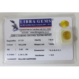 REPORT NO . LY 23CLARITY . N/ACOLOUR . YELLOWSHAPE / CUT . OVALWT . 3.81 CTSDIMENSION . 9-2.8-2.5-3.R . INDEX . 1.76-1.78HARDNESS . 9.0COMMENT . YELLOW SAPPHIRE..